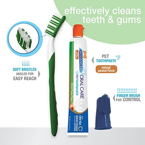 About this item Dog dental kit naturally improves healthy teeth and gums Adult dog toothbrush has an angled neck for better reach Bottle- 2.5 ounce- features Denta-C that’s formulated to help reduce plaque that harbors bacteria Dog finger brush gently slips over finger to remove plaque and food debris Dog oral kit made in the USA Dog toothpaste contains natural peanut flavor pups love