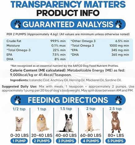 | Feature | For All Breeds and Ages – Our fish oil for dogs liquid pump makes it easy to give your dog omega 3 oils they need to stay healthy and happy. Just squirt the fish oil onto your puppy or dogs food. |